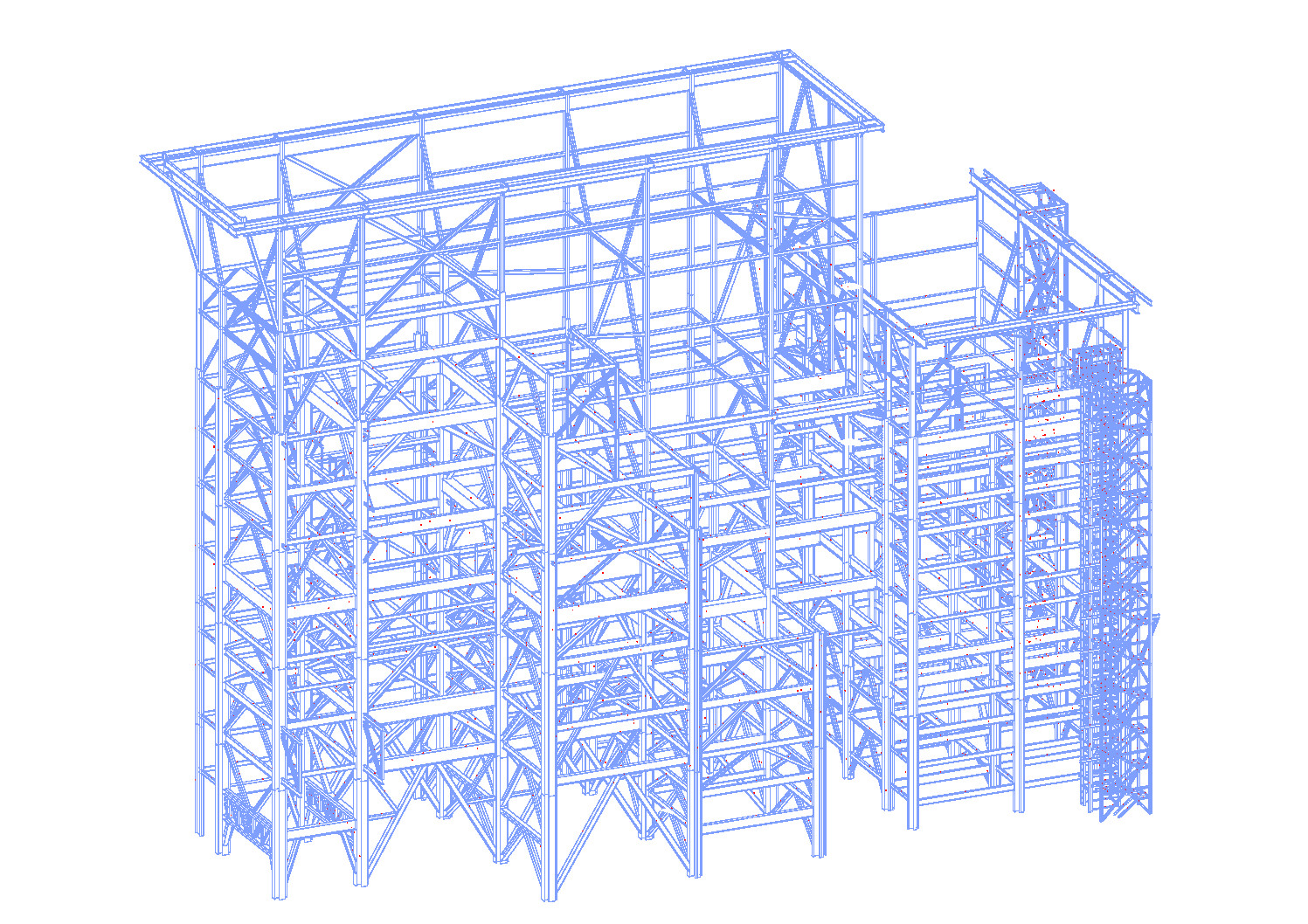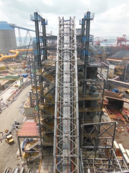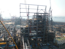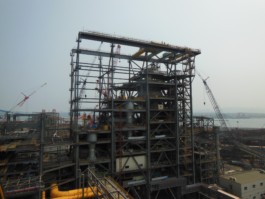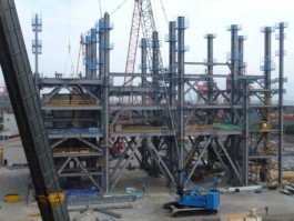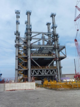 Eine Herausforderung bei der Berechnung und Konstruktion der ca. 12.000 Tonnen schweren Stahlkonstruktion waren die in großer Höhe montierten 3 Reaktoren mit einem max. Betriebsgewicht von jeweils ca. 4.500 Tonnen.