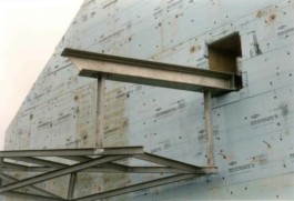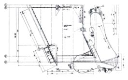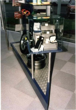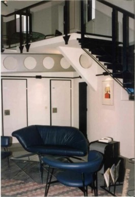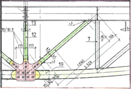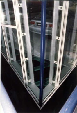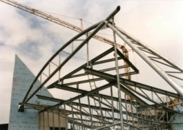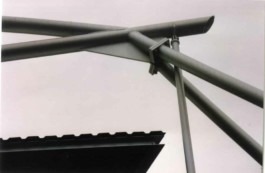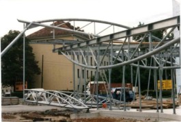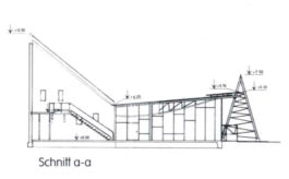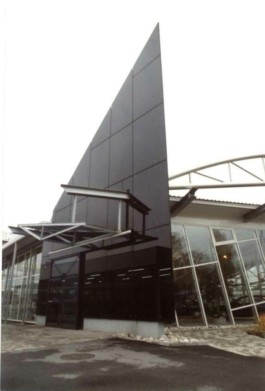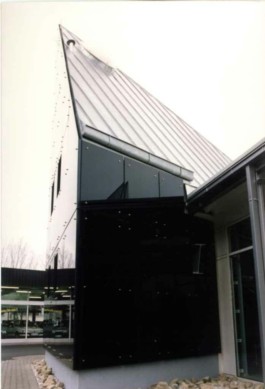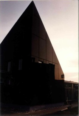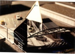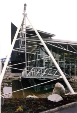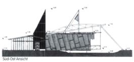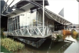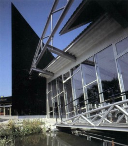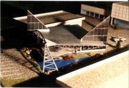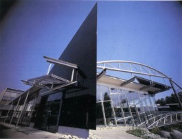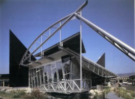 Stahl-Glas-Konstruktion, die in einem Garten mit einem rund 200m2 großen Teich eingebettet wurde. Der Grundriss des Pavillons stellt einen Rhombus dar, der durch Fachwerkbinder überspannt wird. An zwei Ecken wurden Stahlbetontürme errichtet, die mit Emailglas verkleidet sind. Das linke Auflager des Bogenbinders ist ein 13 Meter hoher, ebenfalls glasverkleideter Stahlbetonturm.